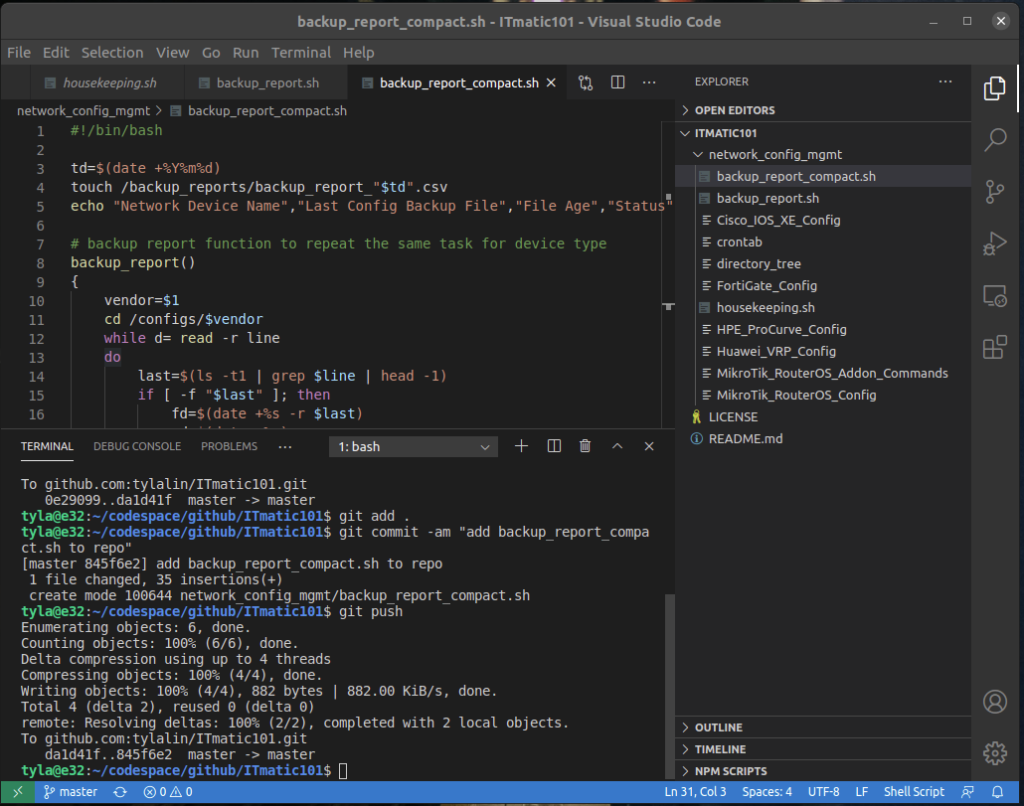 အခုတော့… စာရေးသူရဲ့ bash programming နဲ့ file တွေကို ဘယ်လိုမျိုး manage လုပ်သလဲဆိုတာကို အခြေခံအဖြစ်မြင်စေချင်ပြီးတော့၊ automation လုပ်လို့ရနိုင်တဲ့ အကျိုးကျေးဇူးတွေကို မြင်နိုင်ဖို့ရာအတွက် ကြိုးစားကြည့်ရအောင်။ ဒီလို အခြေခံကျတဲ့ bash လိုမျိုးဟာနဲ့ automation တစ်ခုတည်ဆောက်နိုင်ရင် အခြားသော automation platform တွေကို အသုံးပြုပြီးတော့ leverage ပိုပြီးရနိုင်သလဲဆိုတာကို မြင်စေချင်ပါတယ်။ အရင်ဆုံး backup report အတွက်အသုံးပြုတဲ့ bash script အကြောင်းအရင်ဆုံးသွားလိုက်ရအောင်။ ဒီ script ဟာစာရေးသူ housekeeping လုပ်ပြီးတော့ Cisco, Huawei, HPE, MikroTik နဲ့ FortiGate configuration backup file တွေကို /configs directory အောက်မှာသိမ်းဆည်းပြီးတဲ့နောက် ကိုယ့်ရဲ့ file တွေ up-to-date မှဖြစ်ရဲ့လားလို့ စစ်ဖို့သိနိုင်ဖို့ အတွက် အပတ်တိုင်း crontab နဲ့ schedule လုပ်ပြီးတော့ run တဲ့ script ပါ။ ဒီ file ရဲ့နာမည်ကတော့ backup_report.sh ပါ။ GitHub မှာတော့ ဒီ link မှာသွားကြည့်လို့ရပါတယ်။