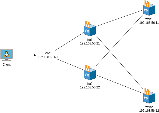 ပထမပိုင်းမှာ keepalived ကိုအသုံးပြုပြီးတော့ VRRP ကိုဘယ်လို setup လုပ်လို့ရသလဲဆိုတာကို Apache web server နှစ်လုံးနဲ့ lab လုပ်ပြခဲ့ပြီးပါပြီ။ တကယ်ဆိုရင် အဲ့ဒီအပိုင်းမှာ setup လုပ်တဲ့ပုံစံက လွယ်အောင်၊ ပြီးတော့ ကိုယ့် PC က CPU နဲ့ RAM မလောက်ခဲ့ရင်တောင် အနည်းဆုံး Virtualbox မှာ VM နှစ်လုံးနဲ့ စမ်းသပ်နိုင်အောင် အရင်ဆုံး ရှင်းပြလိုက်တာဖြစ်ပါတယ်။ လုံးဝ fully high availability (HA) ပုံစံမျိုးတော့ အလုပ်လုပ်မှာမဟုတ်ပါဘူး။ Web server နှစ်လုံးထဲက တစ်လုံး down သွားရင်နောက် တစ်လုံးကဝင်ပြီးတော့ failover လုပ်ရုံသာရှိပါတယ်။ ဆိုပါတော့… ပထမ web server က down တော့မသွားဘူး သို့သော် overload ဖြစ်နေတယ်ဆိုရင် end user experience အတွက်လုံးဝကို အလုပ်မဖြစ်ပါဘူး။ Fully HA ဖြစ်ဖို့ဆိုရင် load balancer လိုပါလိမ့်မယ်။ ဒီအတွက်စာရေးသူတို့ haproxy ကို web server ရဲ့အရှေ့မှာ reverse proxy အနေနဲ့ အသုံးပြုပါ့မယ်။ ပြီးတော့ keepalived ကို web server ပေါ်မှာ မတင်ပဲနဲ့ haproxy နှစ်လုံးနဲ့ keepalived ကိုတွဲပြီးတော့ setup လုပ်မှာဖြစ်ပါတယ်။ ဒီ့အတွက် web server အတွက် Ubuntu 20.04 LTS VM နှစ်လုံး၊ haproxy နဲ့ keepalived တွဲပြီးတော့ အသုံးပြုဖို့အတွက် VM နှစ်လုံးလိုပါလိမ့်မယ်။ အောက်မှာပြထားတဲ့ ပုံအတိုင်း ha1 နဲ့ ha2 က Haproxy နှစ်လုံးဖြစ်ပြီး၊ web1 နဲ့ web2 ကတော့ Apache web server နှစ်လုံးဖြစ်ပါတယ်။ သတိပြုရမှာက ဒီ setup မှာ keepalived ကို ha1 နဲ့ ha2 ပေါ်မှာ setup လုပ်မှာဖြစ်ပါတယ်။