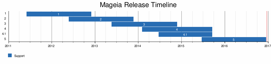 အခုဒီစာရေးနေတဲ့အချိန်မှာ Mageia က 5.1 ပါ။ Mageia ကတော့ ၉လကိုမှာတခါ version အသစ် release လုပ်ပါတယ်။ နာမည်ရပြီးသား Linux distro တွေကတော့ များသောအားဖြင့် ၆လတခါထွက်ပါတယ်။ Mageia က version တစ်ခုကို ၁၈လထိပဲ support ပေးပါတယ်။ အောက်မှာတော့ Mageia ရဲ့ ထွက်တဲ့နေ့ support term နဲ့ kernel version အကျဉ်းချုပ်ဖြစ်ပါတယ်။