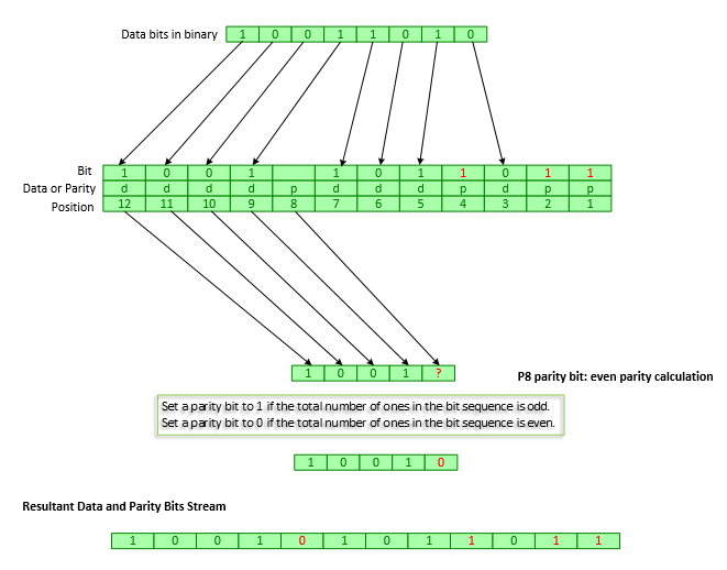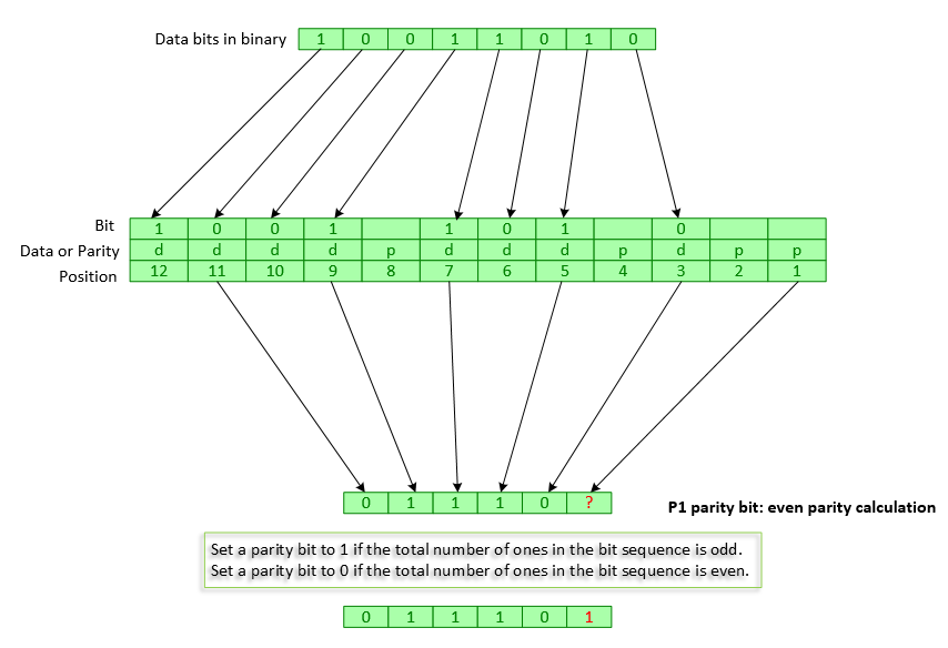 အထက်မှာမြင်ရတဲ့အတိုင်းပဲ ပထမဆုံး parity bit မှာထည့်ဖို့ binary နံပါတ်ကို even parity method ကိုအသုံးပြုပြီးတော့ ရှာပြထားတာ ဖြစ်ပါတယ်။ Even parity ဆိုတာကတော့ one-byte ရှိတဲ့ data stream တစ်ခုမှာ 1 ဖြစ်နေတဲ့ bits အရေအတွက် စုစုပေါင်းဟာ စုံကိန်း (even number) ဖြစ်နေလို့ရှိရင်၊ parity bit ကို 0 ထားရပြီးတော့၊ မကိန်း (odd number) ဖြစ်နေရင်တော့ 1 ဆိုပြီးတော့ထားရပါတယ်။ ဆိုလိုချင်တာက 1 ဖြစ်နေတဲ့ bit အရေအတွက်ပေါင်းလိုက် စုံကိန်း (even number) အမြဲဖြစ်အောင်ထားတဲ့ အတွက် even parity လို့ခေါ်ဆိုခြင်းဖြစ်ပါတယ်။ သူနဲ့ပြောင်းပြန်ကတော့ odd parity ပါ။ 1 ဖြစ်နေတဲ့ bit ပေါင်းလိုက်ရင် မကိန်းဖြစ်အောင်အမြဲထားတဲ့အတွက် odd parity လို့ခေါ်ဆိုခြင်းဖြစ်သည်။