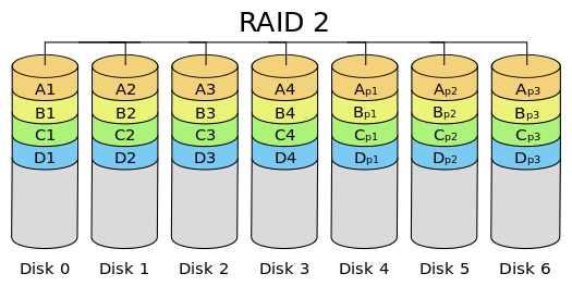 **RAID 2** – ဒီတစ်ခုမှာတော့ အနည်းဆုံး hard disk ၃လုံးလိုပြီးတော့ သူ့ကို data ကိုရေးတဲ့ဖတ်တဲ့အခါမှာ stripe လုပ်ရင် bit level မှာ stripe လုပ်တဲ့အတွက် အရမ်းကိုအသေးစိပ်လွန်းပြီး RAID ထဲမှာပါတဲ့ disks အကုန်လုံးဟာ အမြဲတမ်း synchronise ဖြစ်ဖို့လိုအပ်ပါတယ်။ ဒီ့အပြင် RAID ထဲမှာပါတဲ့ disk တစ်လုံးကပျက်ရင်ဖြစ်ဖြစ်၊ error တက်တာများလာရင်ဖြစ်ဖြစ် error correction အတွက် Hamming code ကိုအသုံးပြုပါတယ်။ Hamming code ကို ECC RAM တွေမှာလည်း error detection နဲ့ error correction အတွက်အသုံးပြုပါတယ်။ ဒီလို error detection နဲ့ correction လုပ်တဲ့အခါမှာ redundant bit သို့မဟုတ် parity bit ကိုအသုံးပြုပြီးတော့ message တစ်ခု ဘယ်နားမှာ bit flip ဖြစ်ပြီးတော့ error တက်နေသလဲဆိုတာကို two-bit အထိ detection လုပ်နိုင်ပြီးတော့၊ one-bit အထိ correction လုပ်ပေးနိုင်ပါတယ်။ ဘာကိုဆိုလိုသလဲဆိုတာကိုတော့ အောက်မှာ Hamming code ဆိုတဲ့ အပိုဒ်မှာ ဆက်ပြီးအသေးစိတ်ရှင်းလိုပါတယ်။ သိထားသင့်တဲ့ computer science ဆိုင်ရာ တွက်ချက်မူမျိုးဖြစ်တဲ့အတွက် နေရာတော်တော်များများမှာ အသုံးချနိုင်မှာလို့ ထင်လို့ပါ။ ဒီတော့… RAID 2 ဆိုတဲ့ဟာလေးကို အဆုံးသတ်ပြီးတော့ အပြီးသတ်လိုက်ရအောင်။ RAID 2 ဒီနောက်ပိုင်းမှာတော့ မသုံးကြတော့ပါဘူး။ အဓိက ပြဿနာက RAID 2 ကိုအသုံးပြုတဲ့အခါမှာ multiple read/write requests တွေကို တပြိုင်နက်တည်းမှာမလုပ်နိုင်တဲ့အတွက် performance အတွက်အများကြီး ပြဿနာရှိပါတယ်။ အစပိုင်းမှာ parity bit ကိုအသုံးပြုပြီးတော့ error detection နဲ့ correction အတွက်အသုံးချနိုင်အောင် စပြီးတော့ implement လုပ်ခဲ့ကြပုံရပါတယ်။ အောက်မှာတော့ RAID 2 ဘယ်လိုမျိုး bit level မှာ data တွေကို stripe လုပ်သလဲဆိုတာကိုပြထားပါတယ်။