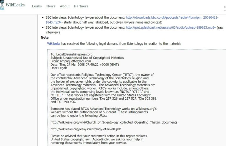 မတ်လ ၂၀၀၈ခုနှစ်မှာတော့ WikiLeaks က Scientology အဖွဲ့ကြီးရဲ့ လျှို့ဝှက် ကျမ်းစာတွေဖြစ်တဲ့ Operating Thetan I ကနေ Operating Thetan VIII အထိ (အတိုကောက်ကိုတော့ OT8 လို့ခေါ်ပါတယ်။) ကို leak လုပ်ပါတယ်။ ပြီးတော့ New era Operating Thetans လို့ခေါ်တဲ့ NOTs ဟာတွေပါ leak လိုက်ပါတော့တယ်။ ၃ရက်အကြာမှာတော့ WikilLeaks ဟာ copyright law နဲ့ငြိစွန်းတယ်ဆိုပြီး တရားစွဲမည့် ခြိမ်းခြောက်စာကို လက်ခံရရှိခဲ့ပါတယ်။ WikiLeaks ကလည်း ၄င်းစာကိုပါ WikiLeaks ပေါ်မှာတည်ပြီးတော့ ပြက်ရယ်ပြုခဲ့ပါတယ်။ နောက်တခါ WikiLeaks ကို လူသိများဖို့ ဖြစ်လာပါတော့တယ်။